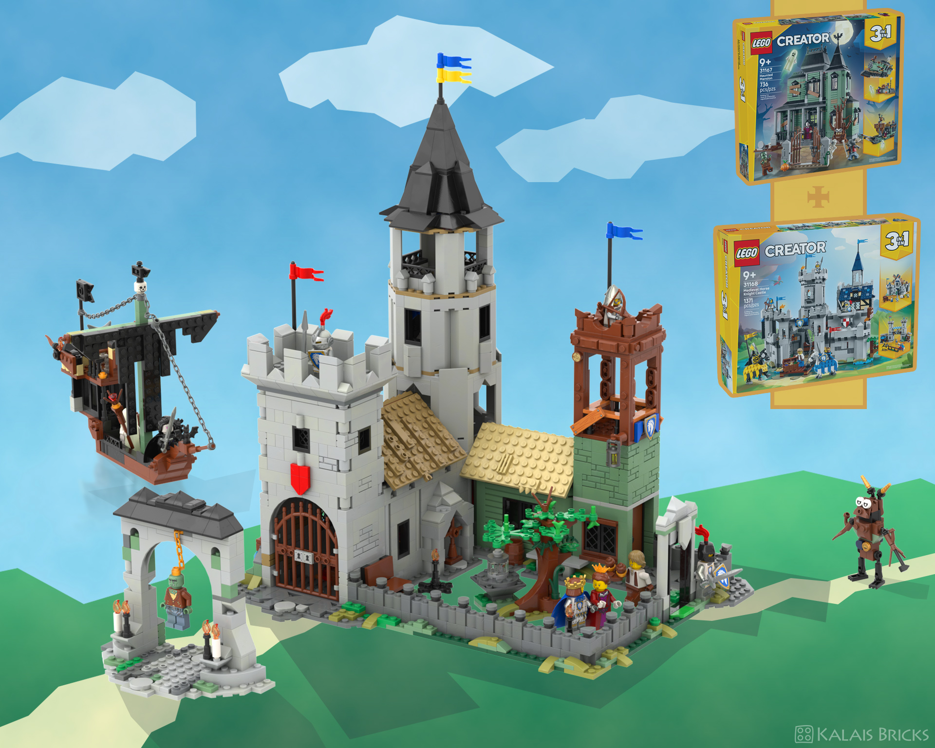My next project, using only bricks from two LEGO Creator sets – Haunted Mansion 31167 and Medieval Castle of Mounted Knights 31168. This time, it's the king's manor/castle. Also contains a gate and an undead ship.